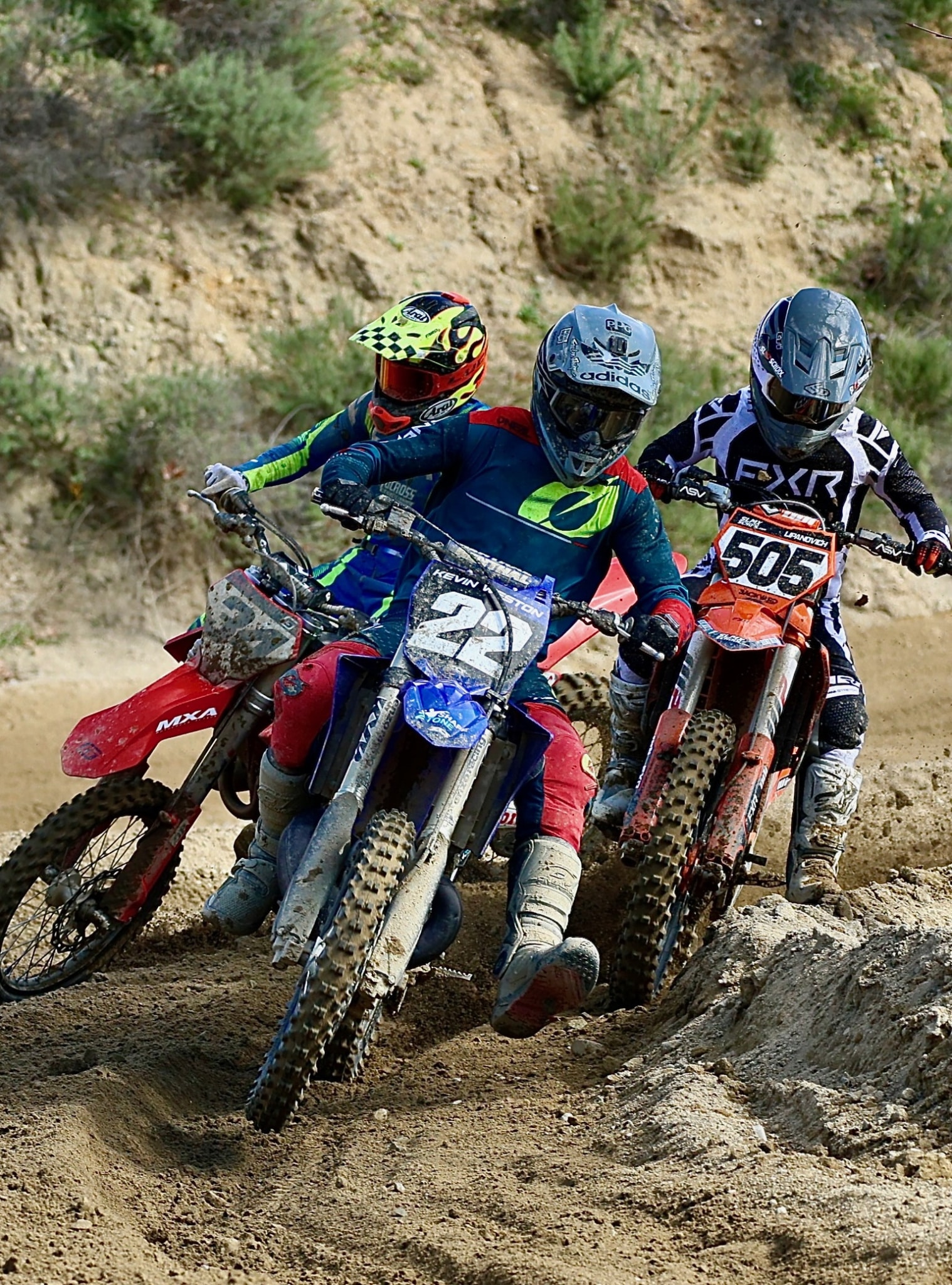 Jet Weston (22) has found himself in a high pressure situation as Sean Lipanovich (505) and Brian Medeiros (34) close in to lap him in Glen Helen’s sand section.